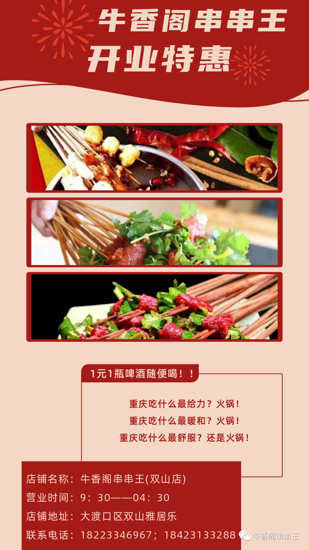 还是那熟悉的味道!还是那熟悉的价格!还是那熟悉的面孔!我最最亲爱的顾客朋友们久等了!4月3日牛香阁串串王(双山店)盛大开业,开业期间优惠多多享不停!劲爆低价,全城最低,实惠巨献,感恩回馈!!双山的伙伴们看过来哦!~