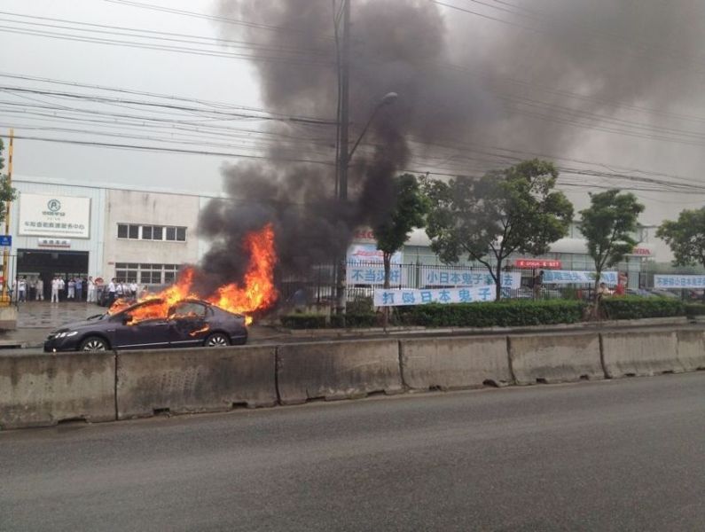 9月13日,上海江杨北路东风本田店门口一车主烧毁一辆自己的本田思域,并拉起有反日、保钓内容的横幅,致使江杨南路南向北方向暂时封闭,消防车随后赶到