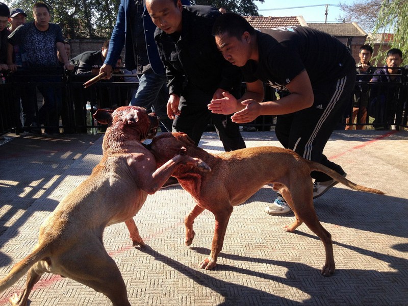 记者调查得知,斗狗赌博圈在北京悄然兴起。斗狗者们以每年超过万元的投入饲养、训练,跑步机、轮胎成为训练比特犬的工具。斗狗赌局上亦有千术,部分狗主人在赛前给狗注射兴奋剂,或在狗身上涂抹麻醉药。10月10日,记者暗访了北京郊区的一家斗狗场,半天时间,斗狗赌资总计约为20万元。 CFP供图 谢绝转载