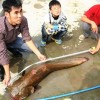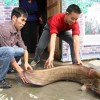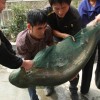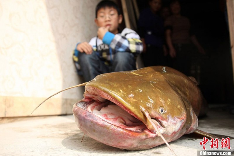 近日,重庆黔江区一名钓鱼爱好者在黔江阿蓬江垂钓,钓起一条45斤重的野生“鲶鱼王”,这在鲶鱼界实属罕见。当地一家鱼庄老板以2700元的价格买下该“鲶鱼王”,作为“镇店之宝”供客人观赏。重庆渔政部门表示,鲶鱼非野生保护动物,垂钓者又是以正常捕鱼手段捕获,因此渔政部门不能强行解救。不过专家称,人工饲养难以符合野生鲶鱼的野生环境,极易使鱼生病,因此建议鱼庄老板尽快将“鲶鱼王”放生。中新社发