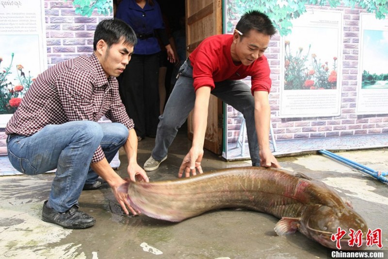 近日,重庆黔江区一名钓鱼爱好者在黔江阿蓬江垂钓,钓起一条45斤重的野生“鲶鱼王”,这在鲶鱼界实属罕见。当地一家鱼庄老板以2700元的价格买下该“鲶鱼王”,作为“镇店之宝”供客人观赏。重庆渔政部门表示,鲶鱼非野生保护动物,垂钓者又是以正常捕鱼手段捕获,因此渔政部门不能强行解救。不过专家称,人工饲养难以符合野生鲶鱼的野生环境,极易使鱼生病,因此建议鱼庄老板尽快将“鲶鱼王”放生。中新社发