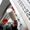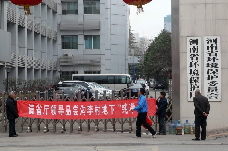 3月11日上午,河南叶县城关乡沟里村的几位农民在郑州市东明路河南省环境保护厅门前拉起横幅,欲请厅长“喝纯净水”。据村民代表称,村子附近就是该县产业集聚区,有水泥厂、盐化公司、烧碱厂、盐酸厂等多家企业在这里落户。企业造成该地环境污染严重,尤其是盐化公司投产以来,村民们赖以生存的地下水已经无法饮用,他们只得依靠购买桶装水生活,而该盐化厂竟然通过了省环保厅的环境评估。IC供图 请勿转载