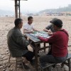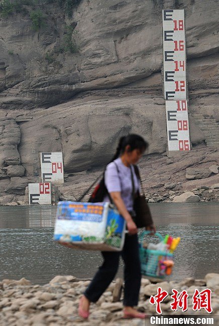 4月1日,一市民正在江边出售饮料。嘉陵江重庆段干枯的河床成为市民的娱乐之地,不少江段裸露的河床,甚至宽过航道。重庆海事部门表示,重庆多航段已实施限航,预计枯水期4月底才能缓解。中新社发 陈超 摄