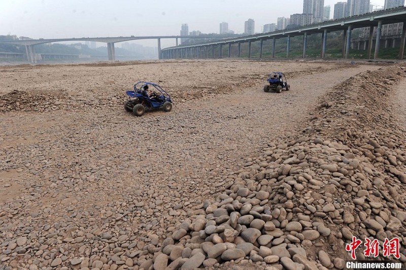 4月1日,市民在干枯的河床上玩起跑跑卡丁车。嘉陵江重庆段干枯的河床成为市民的娱乐之地,不少江段裸露的河床,甚至宽过航道。重庆海事部门表示,重庆多航段已实施限航,预计枯水期4月底才能缓解。中新社发 陈超 摄