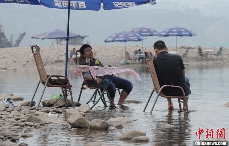 4月1日,重庆市民在江中泡脚纳凉、喝茶聊天。重庆气温近日持续上涨,很多市民选择在江边消暑纳凉。中新社发 陈超 摄
