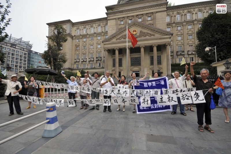 2012年9月10日,重庆大轰炸受害者、幸存者在重庆市高级人民法院向日本政府发起索赔起诉,要求日方就战争伤害道歉、赔偿。据了解,这些受害者和幸存者是1938年到1943年,日本侵略中国当年重庆大轰炸的见证者,他们分别来自重庆市渝中区、九龙坡区、涪陵区等地,年龄最大的已经92岁,这是他们首次在中国向本地法院起诉日本侵略战争。图为当日,重庆大轰炸受害者在重庆市高级人民法院办公大楼前声讨日本侵略罪行。张凤/CFP