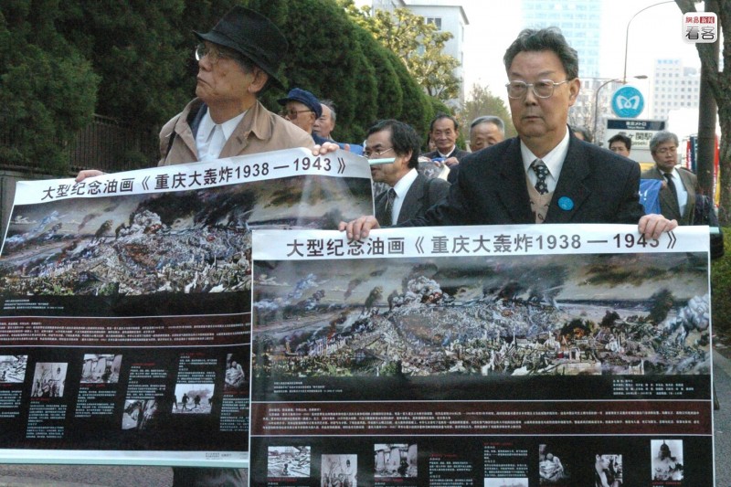 2006年3月30日,在日本东京律师会馆门前,中国重庆大轰炸受害者代表手举标语,要求日本政府谢罪赔偿。当日,由12名重庆大轰炸受害者代表组成的诉讼团向东京地方法院提起诉讼,强烈要求日本政府对中国受害者进行谢罪和赔偿。这也是重庆大轰炸受害者首次正式进入诉讼索赔的法律程序。新华社 马平 摄